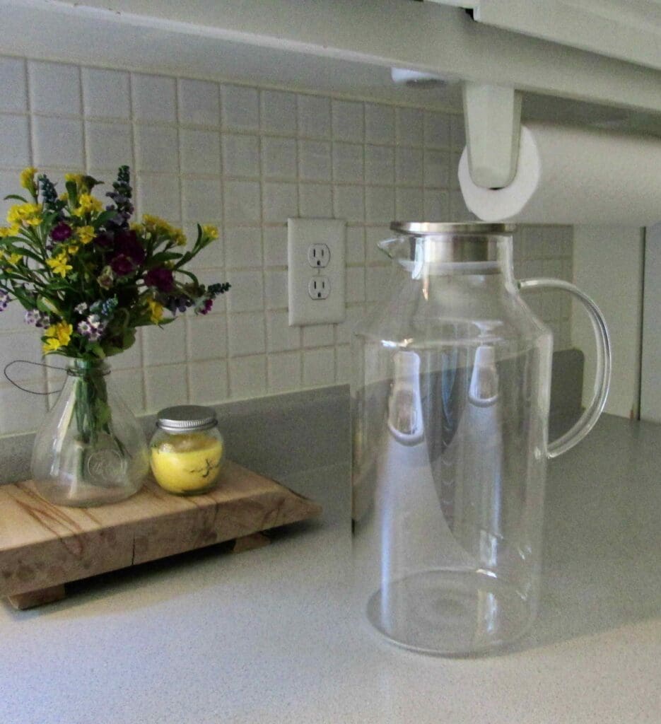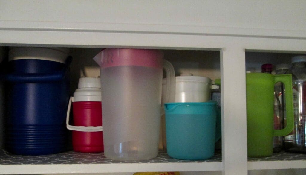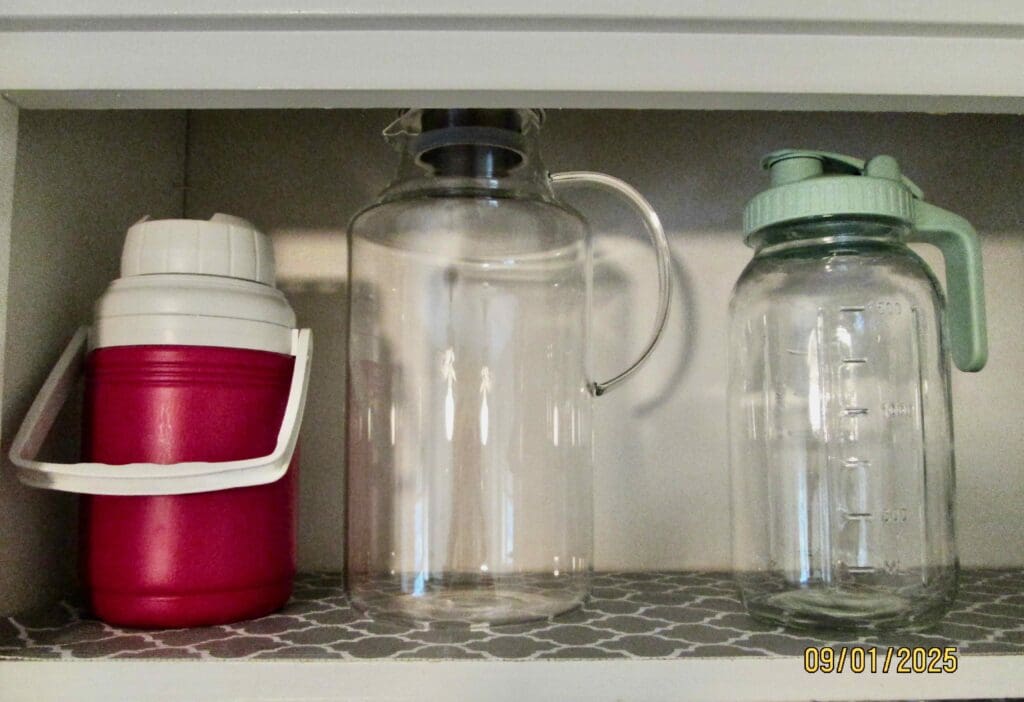 After brainstorming with my daughter on what I needed to serve my family at holiday get togethers , I found I only needed one gallon pitcher for sweet tea and one half gallon pitcher for unsweet tea. Everything else could go. The plastic rubbermaid pitchers were worn, stained, and I always felt unsafe pouring boiling water into the plastic when some chemical might leach out and contaminate the tea.