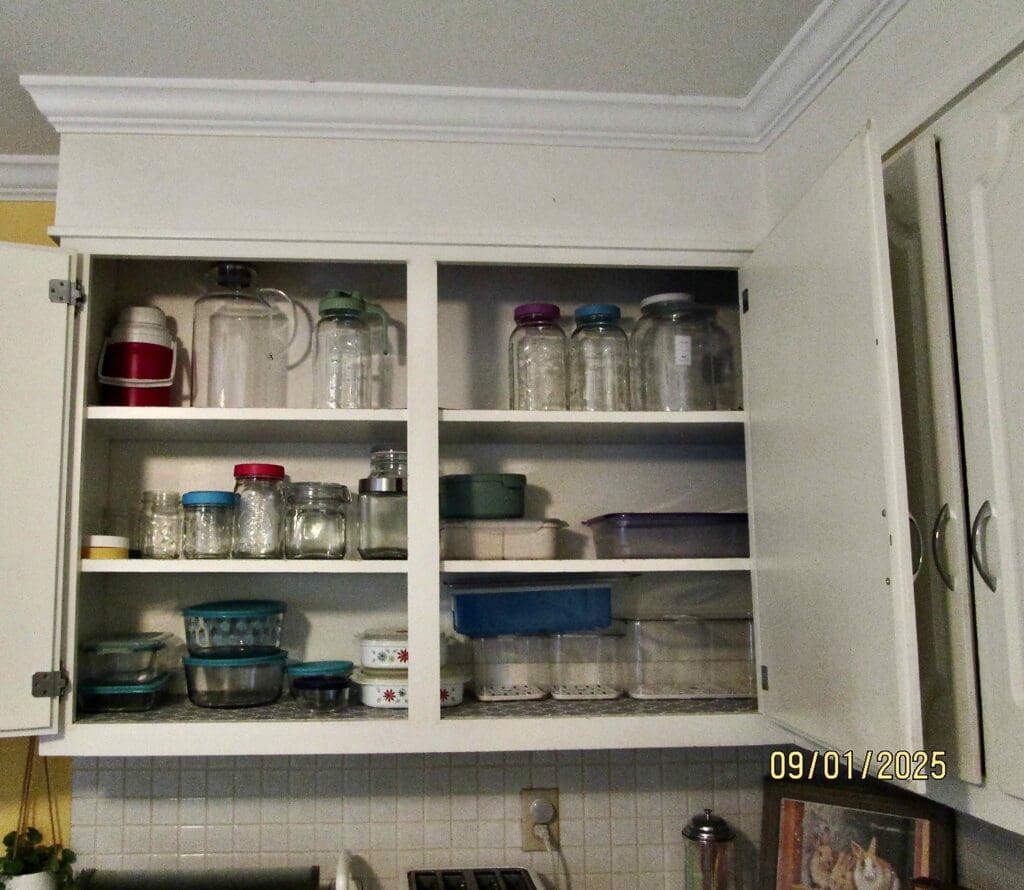 I have extra canning jars with BPA free plastic lids on the second shelf for snack and food storage. Other leftover storage is on the first shelf in easy reach. Even where I store these becomes a decision to make, on what works for me, and not copy what others have done on YouTube. (Maybe I should stop watching so much YouTube… hummm…)