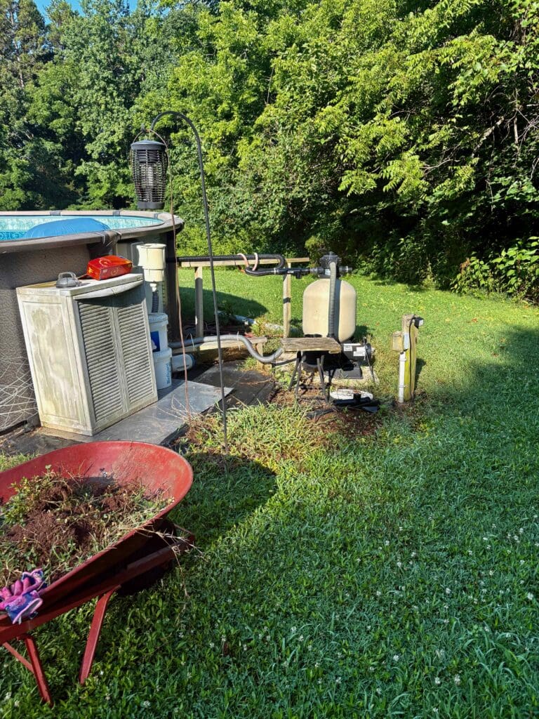 But, the job wasn’t totally finished. The area where the pool pump and pool supplies were kept was overgrown with grass.