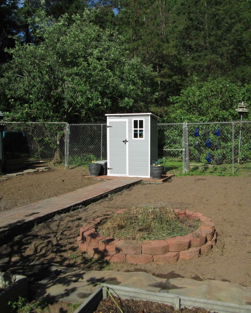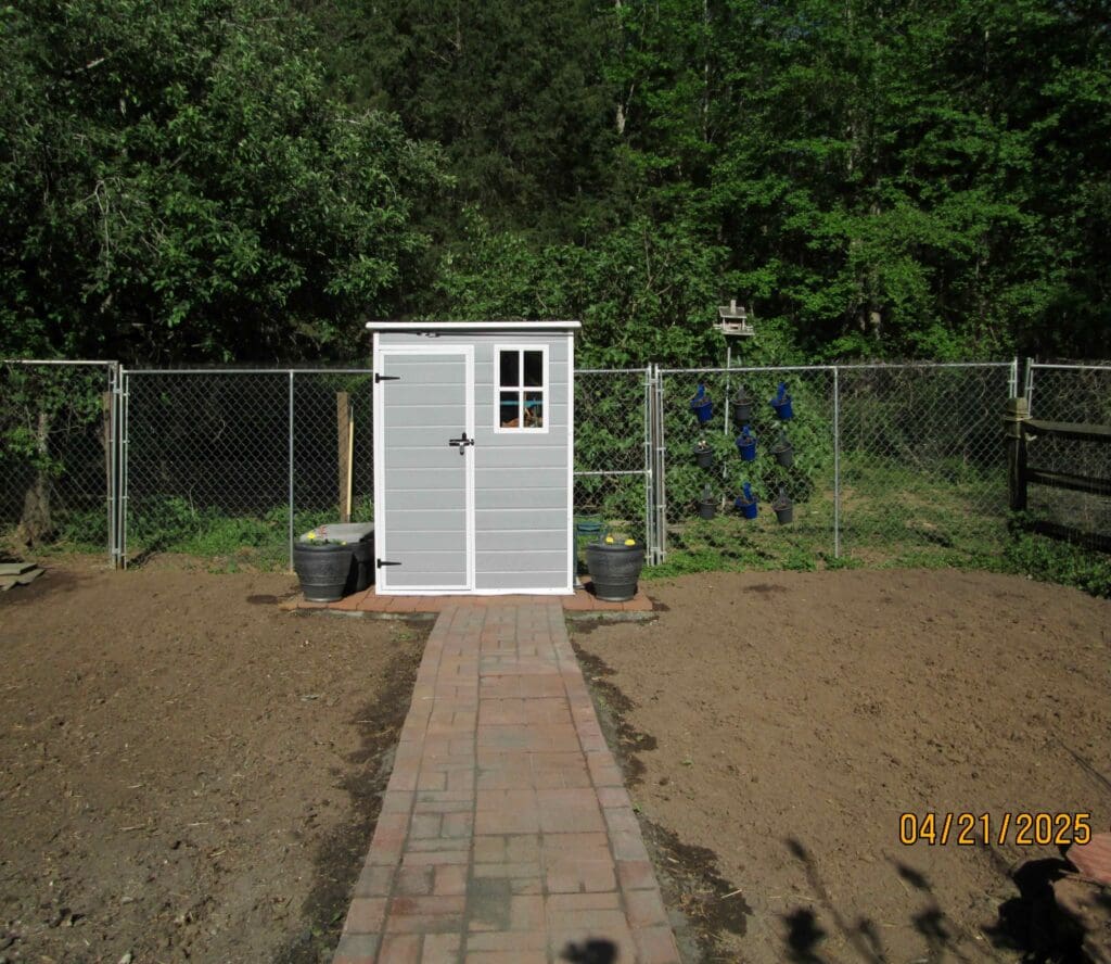 The finished garden storage shed, brick pad, and walk way.