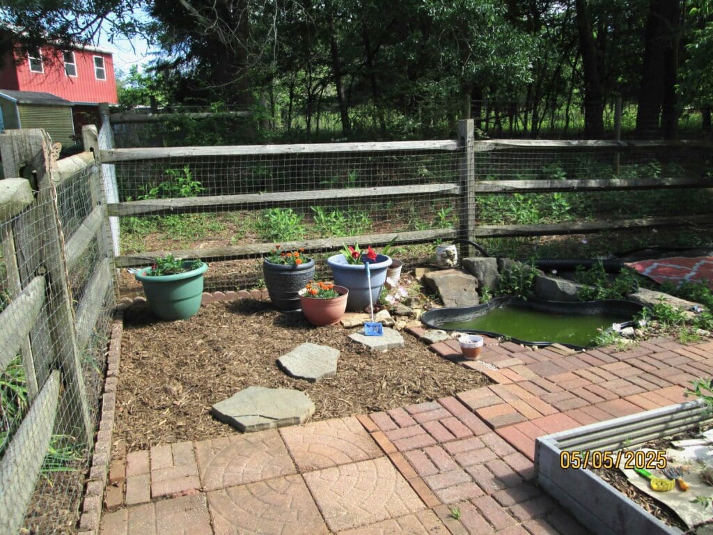 The next area of dominion was the garden table and umbrella. I use the table to hold drinks, seeds, vegetables, and for periods of rest when working in the garden. Each year I put an umbrella in the center of the table for shade. And each year, no matter how we position it into place, the umbrella blows out during wind or storms and ends up in one of the garden beds, or in the frog pond, with the table and chairs turned over. It has blown over, even when closed down.