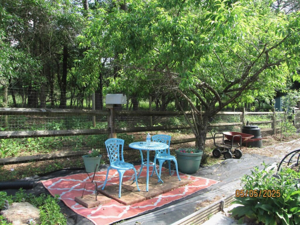 Here is the table under the peach tree. I recognize the fact that I might occasionally get a small peach falling on my head. But one small peach to the head is worth it to not have the umbrella blowing across the garden and tearing up my beds.