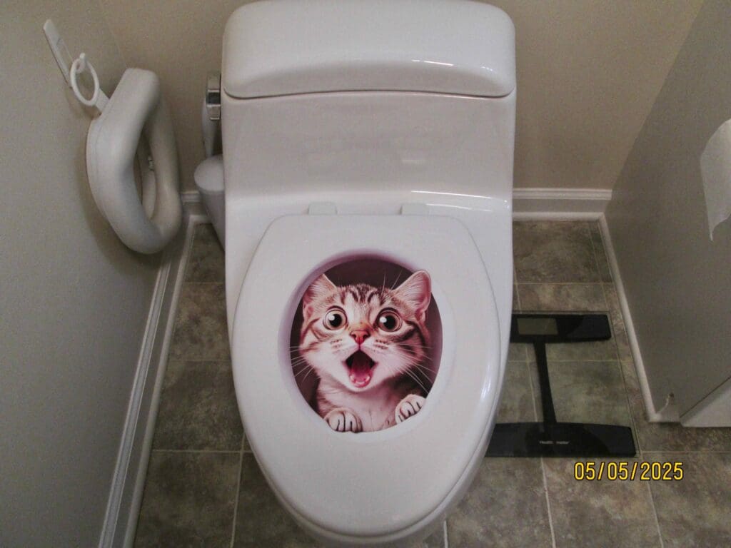 My toilet seat was getting old and stained. So I sprayed it with dawn power wash and left it soaking. That stuff is so strong, it took the paint right off. So I decided to put some leftover primer on the seat rim, and use a sticker to cover the top of the lid.